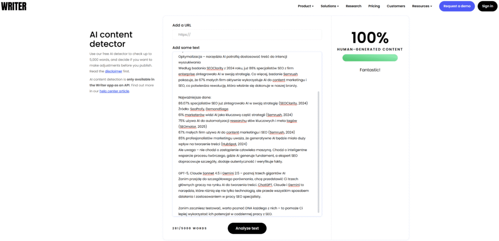 🥉 Writer AI Content Detector (darmowy i prosty)
