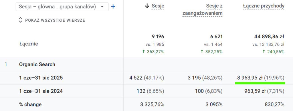 Najważniejszy efekt: +3 325% więcej sesji z organicznych wyników Google